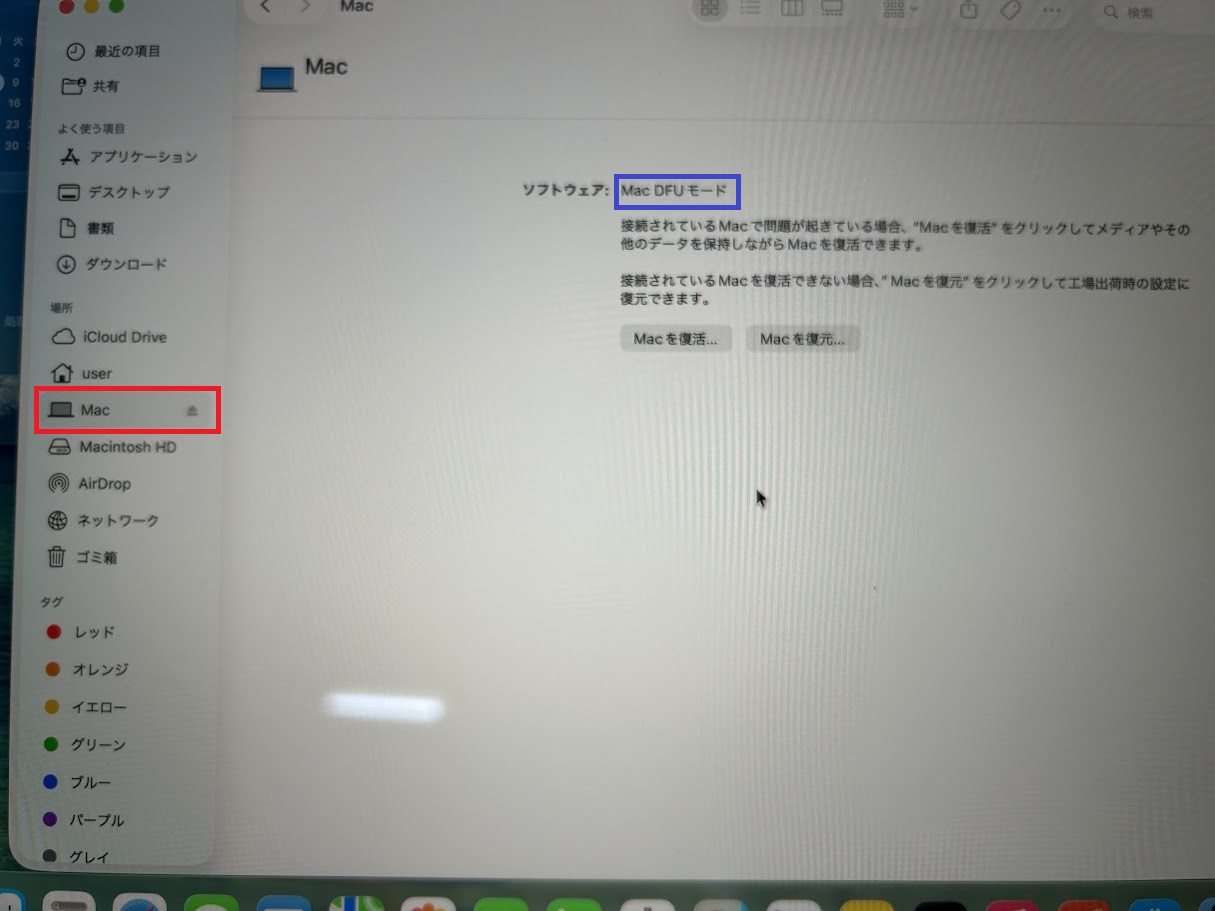 ソフトウェアの表記が「Mac DFUモード」(青囲み)かよく使う項目に「Mac」(赤囲み)が追加されている