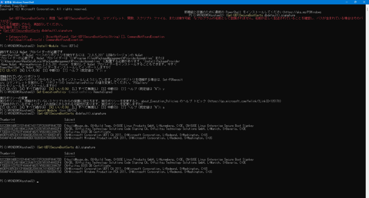 Get-UEFISecureBootCerts : 用語 'Get-UEFISecureBootCerts' は、コマンドレット、関数、スクリプト ファイル、または操作可能 なプログラムの名前として認識されません。名前が正しく記述されていることを確認し、パスが含まれている場合はそのパスが正し いことを確認してから、再試行してください。 発生場所 行:1 文字:2 + (Get-UEFISecureBootCerts db).signature + ~~~~~~~~~~~~~~~~~~~~~~~